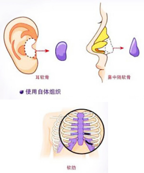 自体软骨隆鼻术中所用的软骨组织按照部位被分为:耳软骨、鼻中隔软骨、肋软骨。