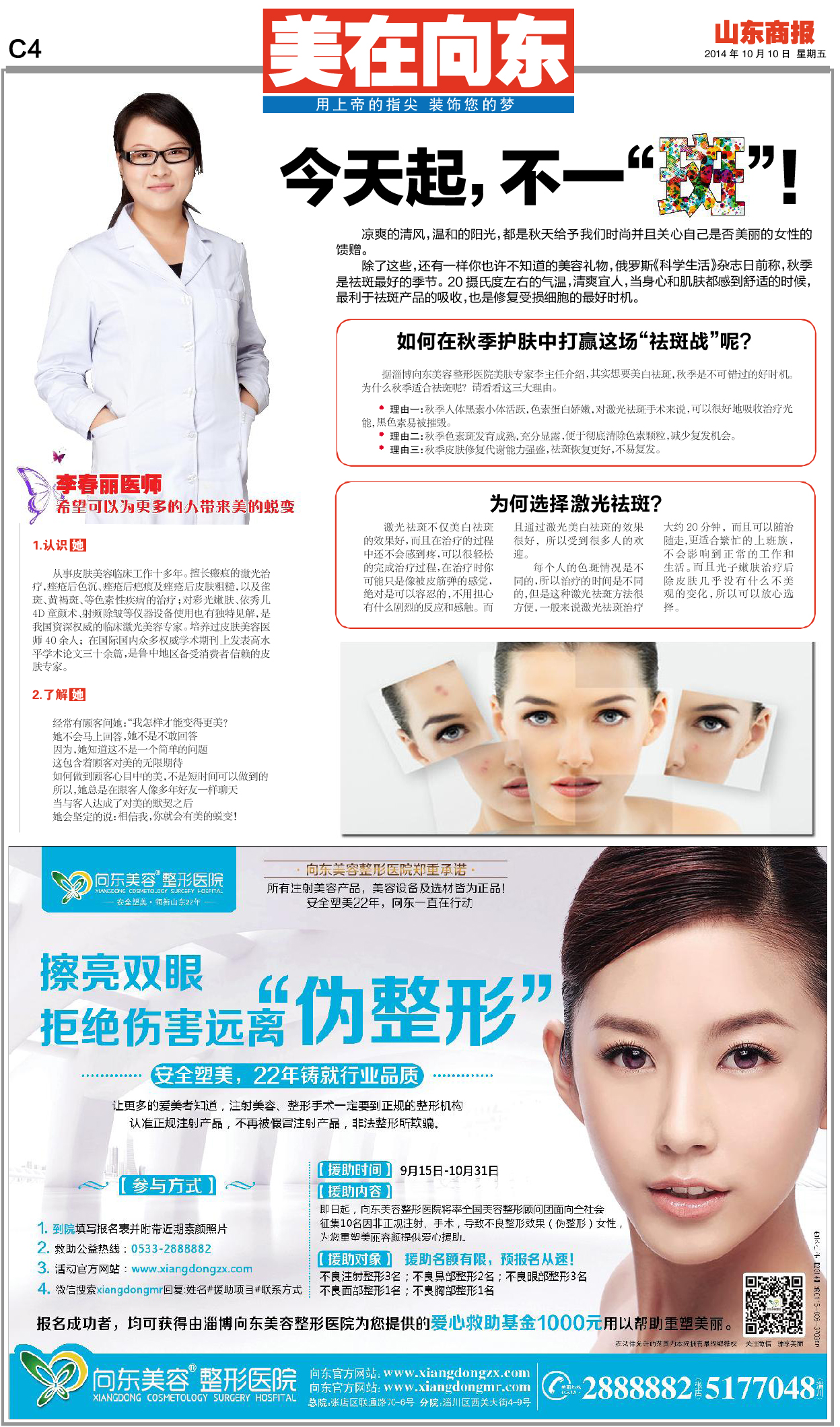 据淄博向东美容整形医院美肤专家李主任介绍,其实想要美白祛斑,秋季是不可错过的好时机。为什么秋季适合祛斑呢?请看看这三大理由。